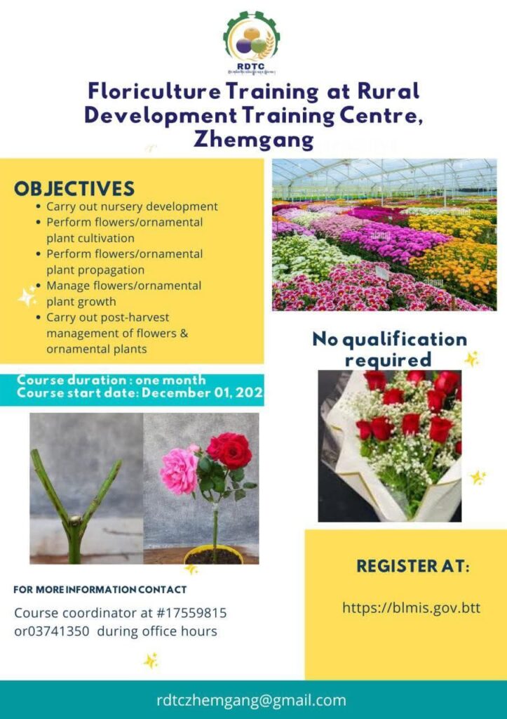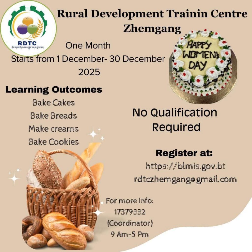 The Rural Development Training Centre, Zhemgang under Ministry of Education and Skills Development is pleased to announce the availability of the following funded training program: