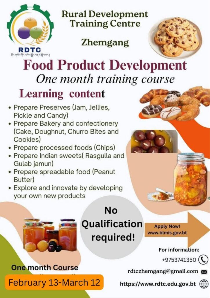 The Rural Development Training Centre, Zhemgang under Ministry of Education and Skills Development is pleased to announce the availability of the following funded training program: